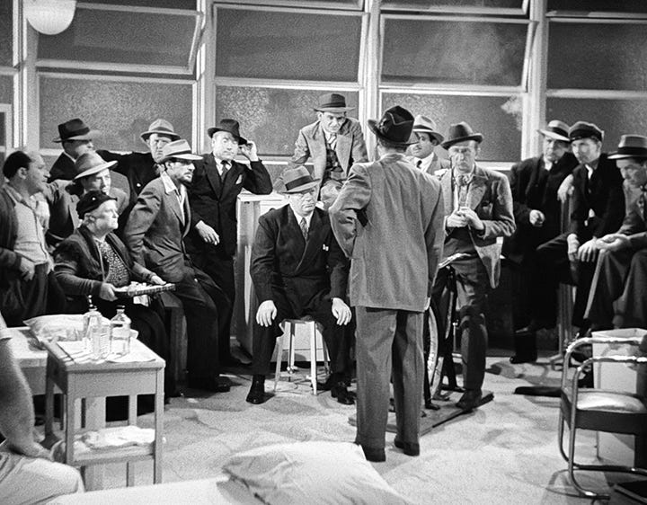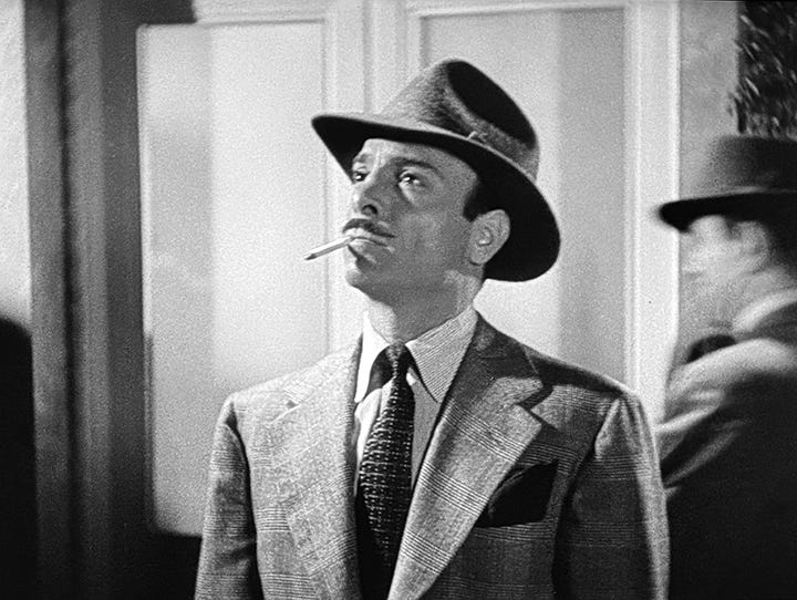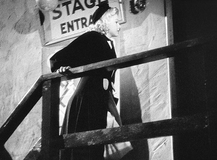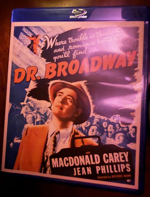 Eventually Mann would realize, or knead plastically into his pictures, his own personal vision of Space for character action to materialize-itself-within on different points, of a Space in (or a Space that is) the frame that there manifests and, perhaps in form alone, takes the occasion to overtake the intensity of the human psychologies suggested by the scripted dialogue. The exposition of space begins here, in Dr. Broadway, with a not overly concerted succession of oblique planes that nevertheless complicate the perceptions attained in the point of view among onscreen characters and movie spectators.