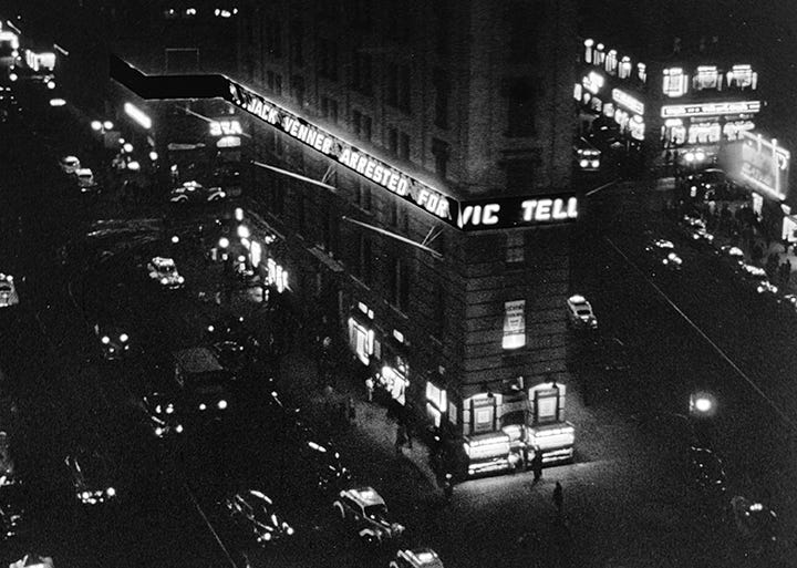 As a lightly dramatic story (adapted from the production’s purchase of rights to three Borden Chase short stories featuring the “Dr. Broadway” character), the film holds an entertaining tone, the always presented hum of city traffic, and so on a commercial level it succeeds. I’ve seen the film twice and the story, so far as I can twice tell, involves a mix of mid-rate hotel rooms and undecorated apartments. It’s a World’s Fair corner exhibition of a city like 1940s-movie-New-York. The country’s not at war, it appears. Soon to be enlisted officer and B-grade lead Macdonald Carey (best known as the detective that a year later gets close with Teresa Wright in Hitchcock’s Shadow of a Doubt, before going on to an alcoholic blitz and gaining second fame on daytime TV soap Days of Our Lives) portrays Chase’s Dr. Broadway (actual surname “Kane”) who might be a doctor, might be a Doctor Roberts even, a detective, a man respected around this and that block, what do you want to know, a man who might in fact know what he himself has got to do, the calculating fellow not making too much of a rush of it, here in the mix with a crowd gathered round an emergency force tasked with catching when it drops the body of a bleach-blonde beauty named Connie (flash-in-the-pan Jean Phillips) up clinging to a building exterior stories high, threatening to leap to the pavement. A publicity grift it turns out, but first Carey climbs out on the window ledge to save Connie, some Hitchcock heights-play here forecasting, next there’s a corrupt tailor of men’s suits, a backroom card game at Broadway’s place, a few of the well-known Italian-American / assorted tough guy actors of the time, then a side-office medical lab with a mad-doctor sunlamp that cooks sketchy Vic Telli after he’s already been shot dead and left there baking. A lot of murder business before Dr. Broadway concludes, Jean Phillips retakes the ledge for a reason unclear to me, some puckers with Macdonald Carey, give my regards, and so on. •